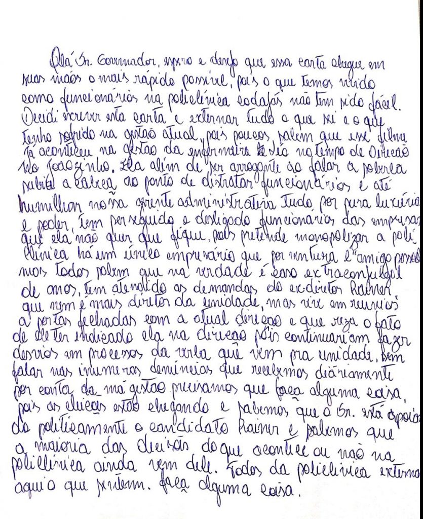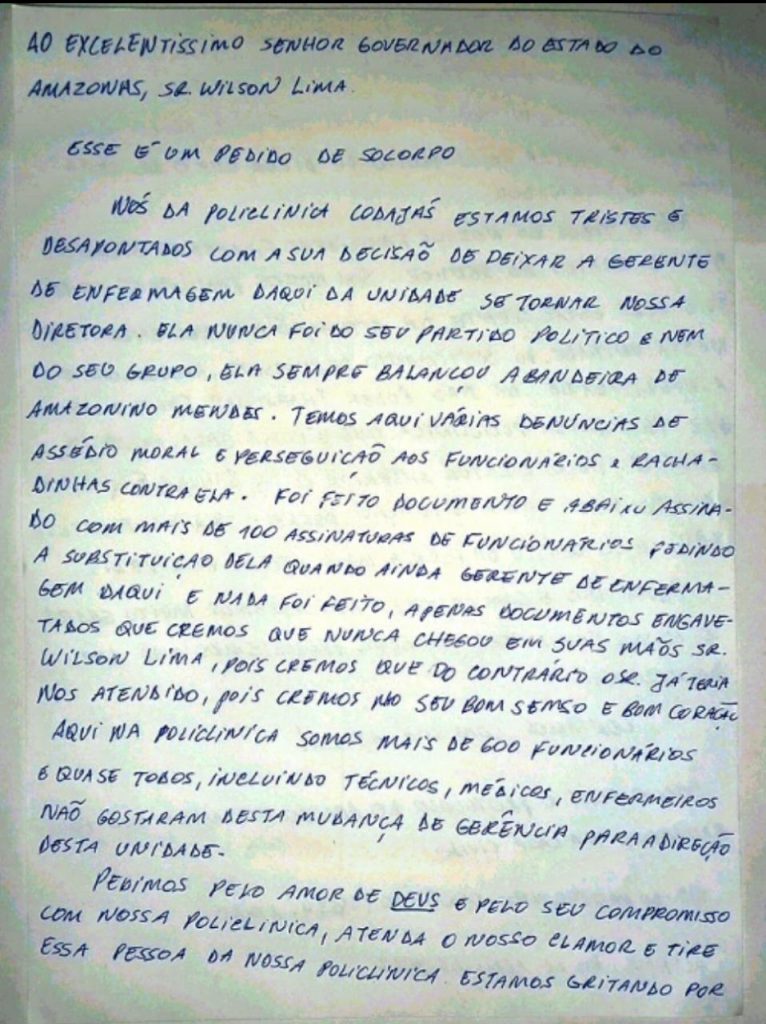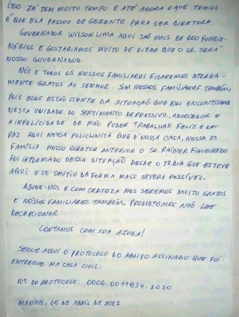 “Pelo Amor de Deus e pelo seu compromisso com a nossa policlínica, atenda nosso clamor e tire essa pessoa policlínica, estamos gritando por isso já tem muito tempo e o que temos agora é que ela passou de gerente a diretora “é um dos trechos da carta enviada ao Governador Wilson Lima.