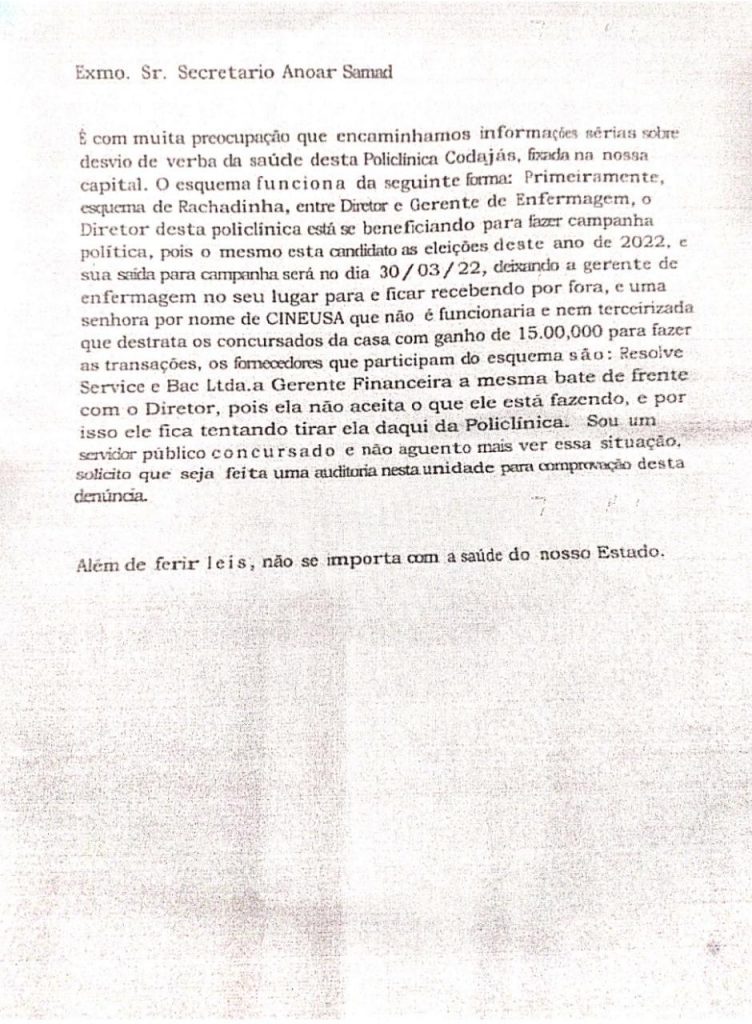 Em outra carta enviada ao Secretario de Saúde do estado do Amazonas, a informação de um suposto esquema de “rachadinha” na Policlínica Codajás acontece e também envolve supostamente o ex-gestor da unidade.