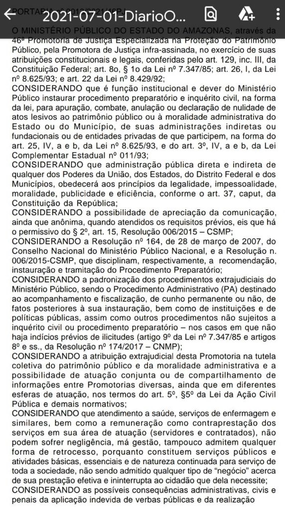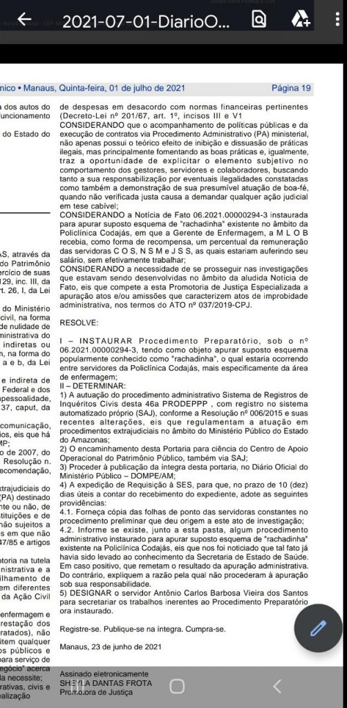 Na portaria, a promotora determinava a expedição de requisição à SES-AM, para que no prazo de dez dias úteis, fossem fornecido cópia das folhas de ponto das servidoras constantes no procedimento preliminar que deu origem a investigação e informe se existe, junto a Secretaria, algum procedimento administrativo instaurado para apurar o suposto esquema de “rachadinha” existente na unidade hospitalar.
